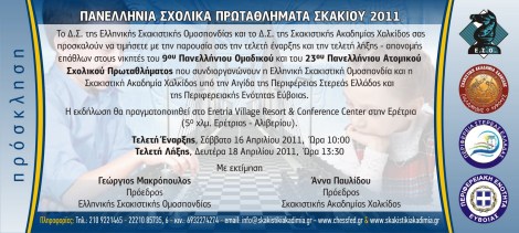 Η Ελληνική Σκακιστική Ομοσπονδία προκηρύσσει την τελική φάση του 23ου Πανελλήνιου Ατομικού Σχολικού Πρωταθλήματος και του 9ου Πανελλήνιου Ομαδικού Σχολικού Πρωταθλήματος για το 2011.