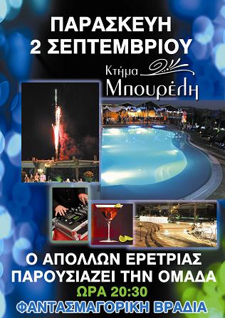 Το Δ.Σ. του Α.Ο. ΑΠΟΛΛΩΝ ΕΡΕΤΡΙΑΣ σας προσκαλεί στην εκδήλωση παρουσίασης της ομάδας, που θα γίνει την Παρασκευή 2 Σεπτεμβρίου 2011 και ώρα 8:30 μμ στο Κτήμα Μπουρέλη στο 1ο χλμ Ερέτριας – Θεολόγου, στην Ερέτρια.