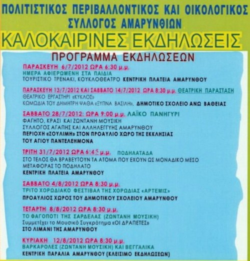 Οι Καλοκαιρινές εκδηλώσεις του Περιβαλλοντικού και Οικολογικού Συλλόγου Αμαρύνθου πραγματοποιούνται με τη βοήθεια της Ιεράς Μητρόπολης Χαλκίδος, των Ιερών Ναών Ευαγγελισμός της Θεοτόκου, Άγιος Ιωάννης, Άγιος Νικόλαος Άνω Βάθειας, του Δήμου Ερέτριας και των καταστημάτων της περιοχής.