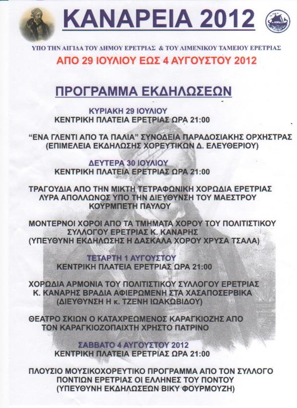 Οι εκδηλώσεις «Κανάρεια 2012» πραγματοποιούνται υπό την αιγίδα του Δήμου Ερέτριας και του Λιμενικού Ταμείου Ερέτριας.