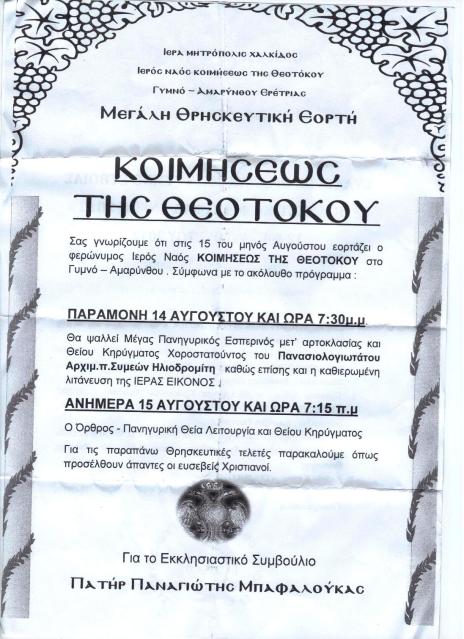 Αξίζει μια επίσκεψη στο χωριό το Δεκαπενταύγουστο, όπου γιορτάζεται n προστάτιδα του Γυμνού Παναγία και διεξάγεται διήμερη εμποροπανήγυρη που συγκεντρώνει το ενδιαφέρον των κατοίκων της ευρύτερης περιοχής.