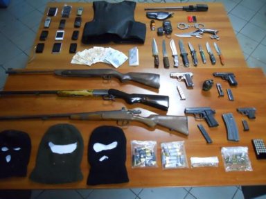 Οι αστυνομικοί κατά τη διάρκεια των ερευνών στα σπίτια των δραστών σε διάφορες περιοχές της Εύβοιας βρήκαν και κατάσχεσαν δυο πιστόλια, δυο πιστόλια κρότου, τρία κυνηγετικά όπλα, μια χειροβομβίδα πολεμικού τύπου, επτά μαχαίρια, ένα αλεξίσφαιρο γιλέκο, ένα πτυσσόμενο στιλέτο, μια συσκευή ηλεκτρικής εκκένωσης (τέιζερ), μια πτυσσόμενη μεταλλική ράβδο, πέντε γεμιστήρες πιστολιών, μια γεμιστήρα για πολεμικού τουφέκι, 99 φυσίγγια διαφόρων τύπων και διαμετρημάτων, τρεις μάλλινους σκούφους τύπου φουλ φέις, ένα σπρέι πιπεριού, ένα ζευγάρι χειροπέδες, πέντε κροτίδες, τρεις κάλυκες, μια θήκη όπλου, 12 κινητά τηλέφωνα, μικροποσότητες κοκαΐνης και ακατέργαστης κάνναβης, ένα πλαστό χαρτονόμισμα των 50 ευρώ, 550 ευρώ και δυο βιβλιάρια καταθέσεων τραπεζών.