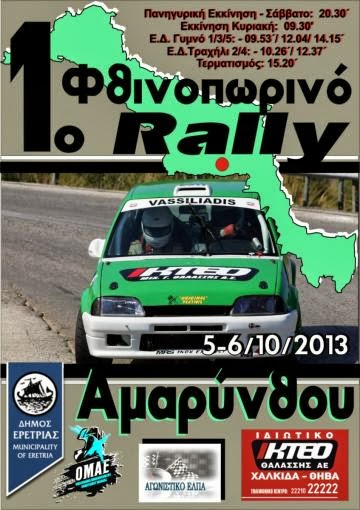 Ο Δήμος Ερέτριας διοργανώνει το 1ο Φθινοπωρινό Ράλι Αμαρύνθου. Ο αγώνας θα πραγματοποιηθεί στο ιδιαίτερης φυσικής ομορφιάς περιβάλλον της περιοχής μας. Το Αθλητικό Σωματείο » Αγωνιστικό Τμήμα ΕΛΠΑ» έχει αναλάβει την οργάνωση του αγώνα.