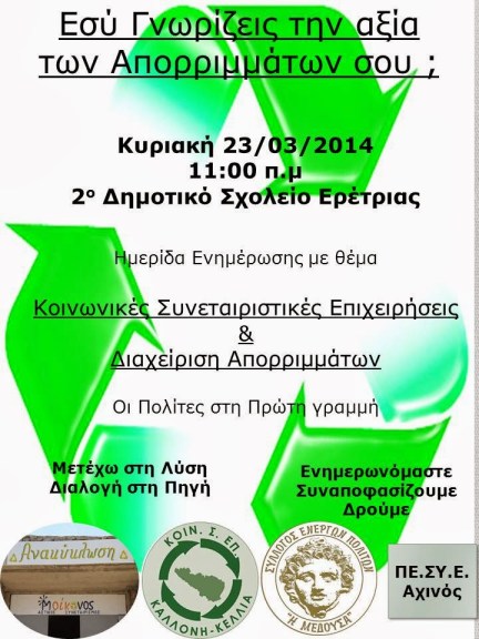 Ούτως ή άλλως η διαχείριση των απορριμμάτων, όπως και άλλων πολλών θεμάτων δεν είναι μόνο θέμα των συλλόγων που ψάχνουν λύσεις, αλλά όλων των πολιτών. Την αποδοχή ή την απόρριψη θα την αποφασίσουμε όλοι μαζί … Το πρώτο βήμα είναι η ενημέρωση … ας το κάνουμε λοιπόν