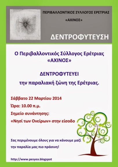 Ο Περιβαλλοντικός Σύλλογος Ερέτριας «Αχινός» Δενδροφυτεύει την παραλιακή ζώνη της Ερέτριας το Σάββατο 22 Μαρτίου 2014, ώρα 10:00 π.μ. με σημείο συνάντησης την είσοδο στο Νησί των Ονείρων. Σας περιμένουμε όλους για να κάνουμε μαζί την παραλία μας πιο πράσινη!