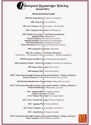Τα θεατρικό εργαστήρι Κύκλος συνεχίζει με μεγάλη επιτυχία τις παραστάσεις κάθε χρόνο εδώ και 15 ολόκληρα χρόνια, 1999-2014. Η αποδοχή, καθώς και η συμμετοχή του κόσμου κάθε χρόνο στις παραστάσεις είναι εντυπωσιακή, ο σκηνοθέτης καθώς και οι ερασιτέχνες ηθοποιοί πραγματικά δίνουν τον καλύτερο τους εαυτό, και φυσικά εισπράττουν το χειροκρότημα και την στήριξη του κόσμου!