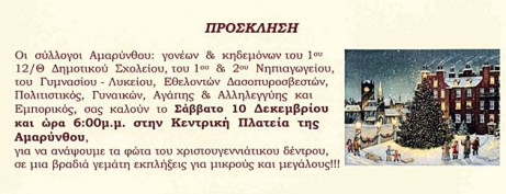 Οι Σύλλογοι Αμαρύνθου γονέων και κηδεμόνων του 1ου 12/Θ Δημοτικού Σχολείου, του 1ου και 2ου Νηπιαγωγείου, του Γυμνασίου-Λυκείου, Εθελοντών Δασοπυροσβεστών, Πολιτιστικός, Γυναικών, Αγάπης & Αλληλεγγύης και Εμπορικός σας καλούν το Σάββατο 10 Δεκεμβρίου και ώρα 6:00 μ.μ. στην Κεντρική Πλατεία της Αμαρύνθου για να ανάψουμε τα φώτα του Χριστουγεννιάτικου δέντρου, σε μια βραδιά γεμάτη εκπλήξεις για μικρούς και μεγάλους.