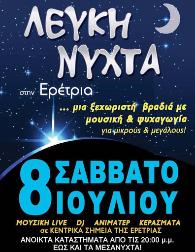 Η «Λευκή Νύχτα» στην Ερέτρια στις 8 Ιουλίου 2017, θα είναι μια υπέροχη, ξεχωριστή βραδιά. Η πόλη πλημμυρισμένη στο φως, με όλα τα καταστήματα ανοιχτά από τις 8:00 το απόγευμα έως και τα μεσάνυχτα, θα σας προσφέρουν την ευκαιρία για έξυπνες αγορές με μεγάλες προσφορές, εκπλήξεις και πολλά δώρα!