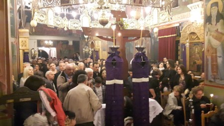 Εν συνεχεία ακολούθησε, η Έξοδος του Εσταυρωμένου Χριστού, ψαλομένου του Κατανυκτικού Αντίφωνου,(Σήμερον Κρεμάται επί Ξύλου》υπό των Ιεροψαλτών ,κατά την οποίαν οι οι πιστοί έραναν με ροδοπέταλα και πλήρης σιγής και κατανύξεως παρακολούθησαν την κατανυκτική ακολουθία.