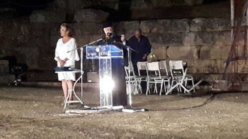 Μετά τους χαιρετισμούς της Δημάρχου και των επισήμων η κ. Αμφιτρίτη Αλημπατέ κάλεσε στο βήμα τον εκπρόσωπο του Μητροπολίτου Χαλκίδος Ιστιαίας και Βορείων Σποράδων κ. κ. Χρυσοστόμου, μιας και από Θεού άρξασθε όπως είπε, πανοσιολογιώτατο Αρχιμανδρίτη Θεαγένη Κόλλια, εφημέριο της τρίτης ενορίας της Ερετρίας, Παναγίας Ελεούσης Μαλακώντα, ο οποίος μεταφέροντας τις ευχές και την ευλογία του Σεβασμιωτάτου προετοίμασε το κοινό για το έργο ΕΛΕΝΗ του Ευριπίδη, που επρόκειτο να παρακολουθήσει.
