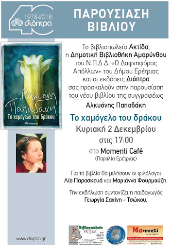 Το βιβλιοπωλείο Ακτίδα, η Δημοτική Βιβλιοθήκη Αμαρύνθου του Ν.Π.Δ.Δ. «Ο Δαφνηφόρος Απόλλων» του Δήμου Ερέτριας και οι εκδόσεις Διόπτρα σας προσκαλούν στην παρουσίαση του νέου βιβλίου της συγγραφέως Αλκυόνης Παπαδάκη Το χαμόγελο του δράκου Κυριακή 2 Δεκεμβρίου στις 17:00 στο Momenti Café (Παραλία Ερέτριας)