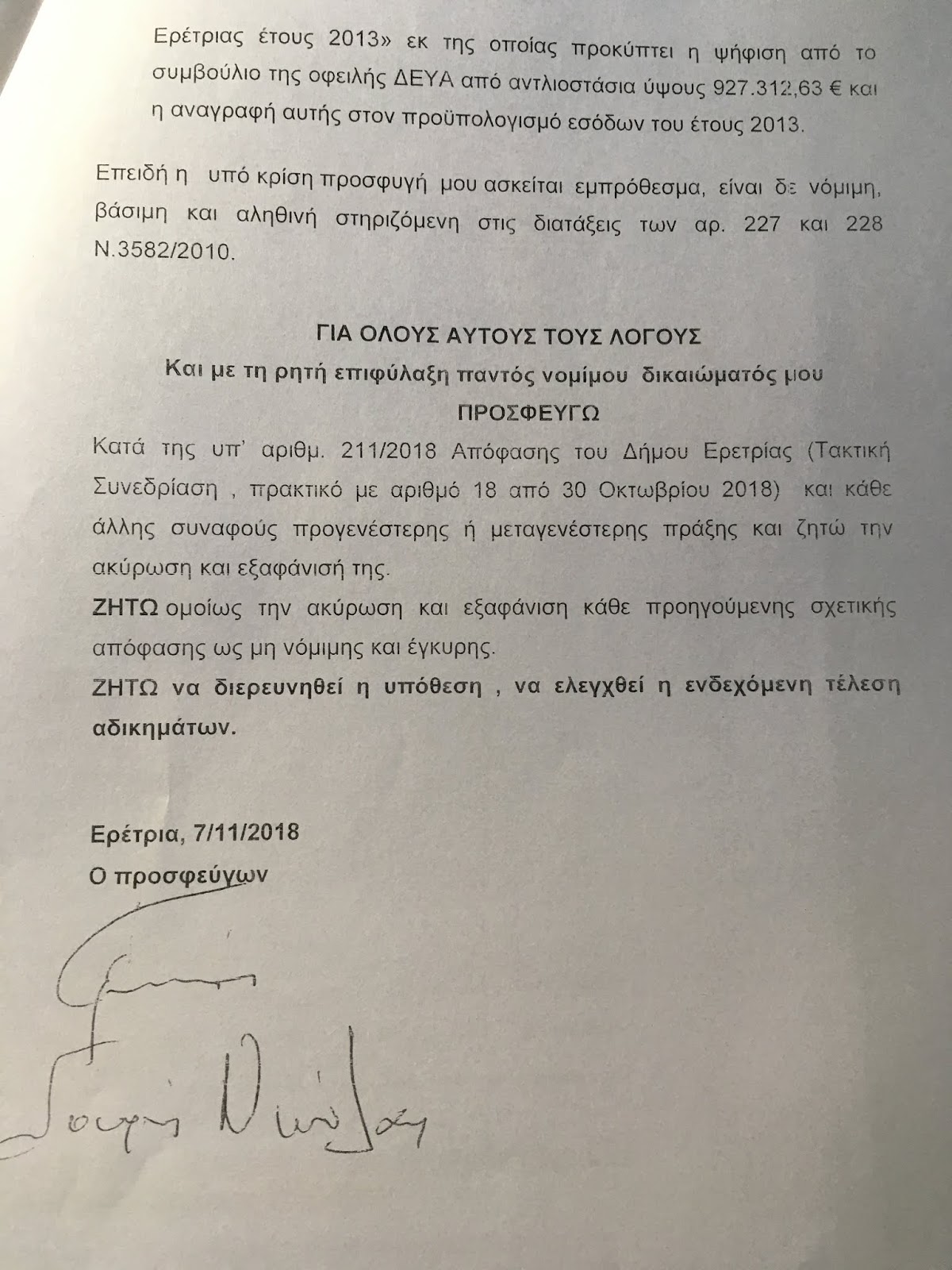 Προσφυγή στην Αποκεντρωμένη, κατά της απόφασης 211/2018 του Δήμου Ερετρίας (γνωστής ως «απόφασης του 1.οοο.οοο),με την οποία ζητά την ακύρωσή της ενώ υποστηρίζει ότι «έχουν τελεστεί αδικήματα κακουργηματικού χαρακτήρα τοσο από τον Δήμο οσο και από την ΔΕΥΑΕ!!