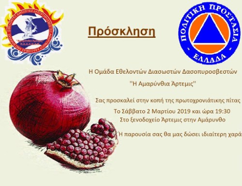 Η Ομάδα εθελοντών διασωστών δασοπυροσβεστών «Η Αμαρύνθια Άρτεμις» πραγματοποιεί εκδήλωση κοπής πρωτοχρονιάτικης πίτας το Σάββατο 2 Μαρτίου στις 7.30 στο Ξενοδοχείο Άρτεμις στην Αμάρυνθο.