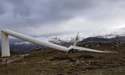 Άλλη μια επικίνδυνη εξέλιξη είχαμε στην περιοχή μας καθώς στη θέση Γκούρι Μάδι, κοντά στο Μαρμάρι, ο ρότορας και τα πτερύγια ανεμογεννήτριας κατέρρευσαν υπό συνθήκες άπνοιας, χωρίς ευτυχώς άλλες συνέπειες.