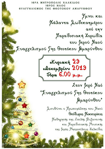 Κυριακή 29 Δεκεμβρίου 2019 ώρα 18:00 στον Ι. Ν. Ευαγγελισμό της Θεοτοκου Αμαρύνθου.